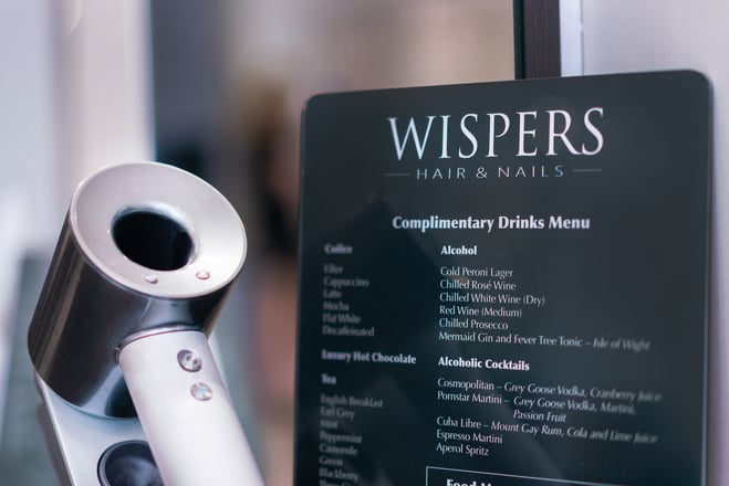 The salon is equipped with the latest equipment such as Ceramic Rollerballs which ensure the best possible colour and scalp treatment, iPads for your usage during your service, a full complimentary drinks service including alcohol (Wispers has an alcohol license) and an extensive range of magazines for your review. Our nail room is self contained offering you a private treatment during your service.